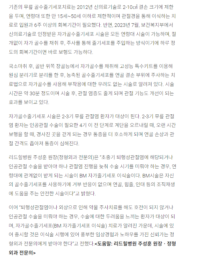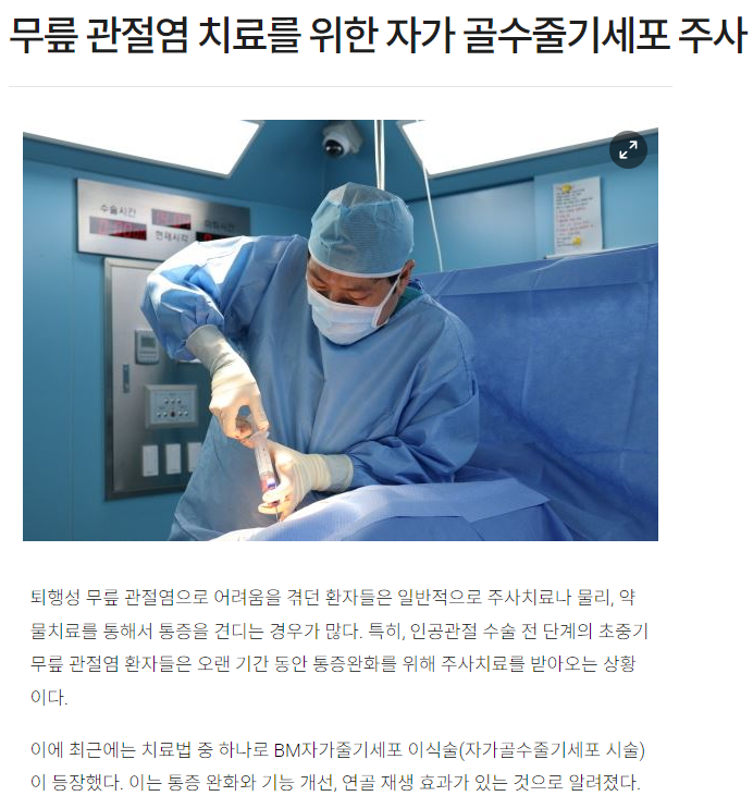 [언론보도]무릎 관절염 치료를 위한 자가 골수줄기세포 주사 BM시술 _ 메디소비자뉴스